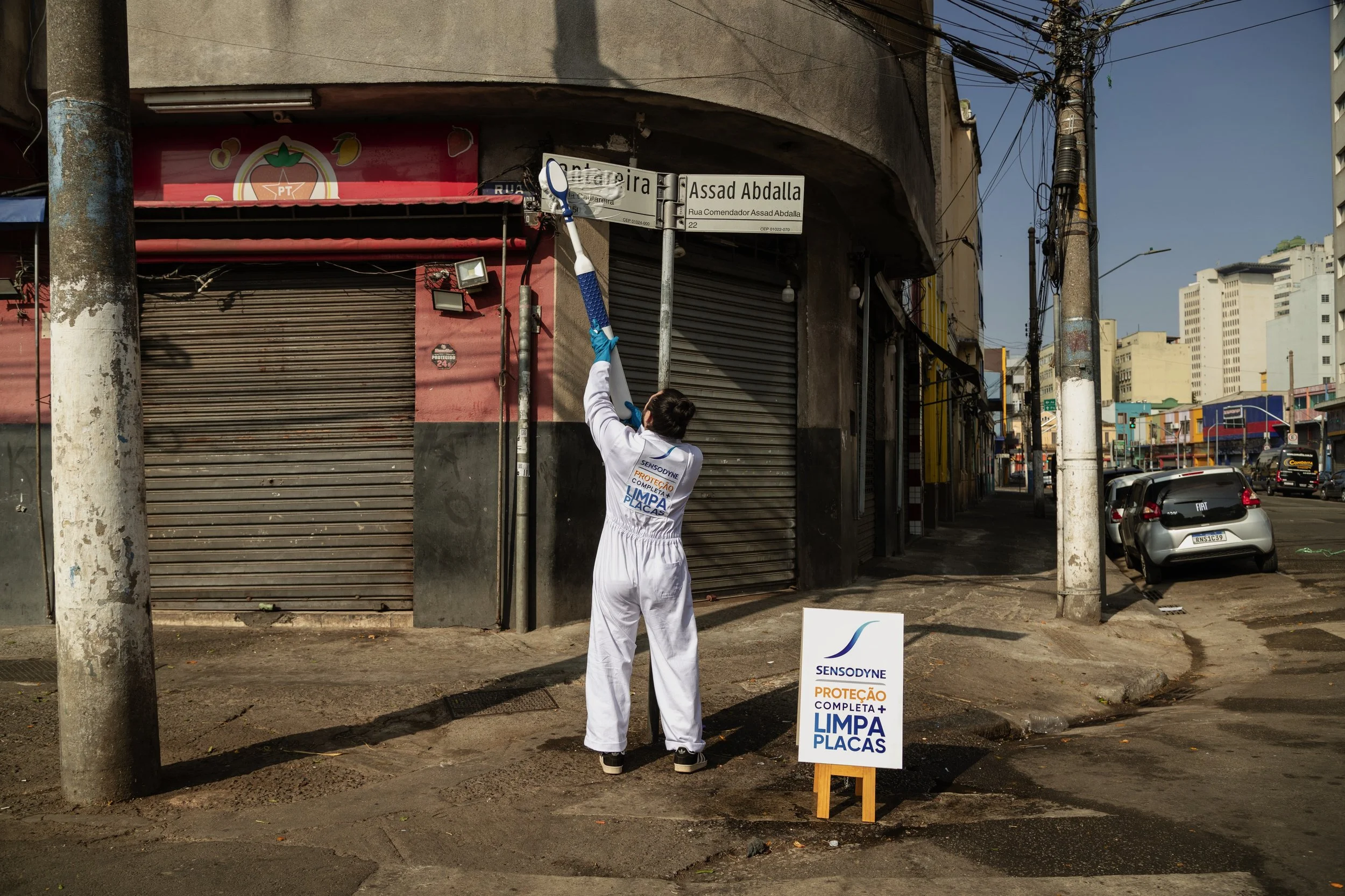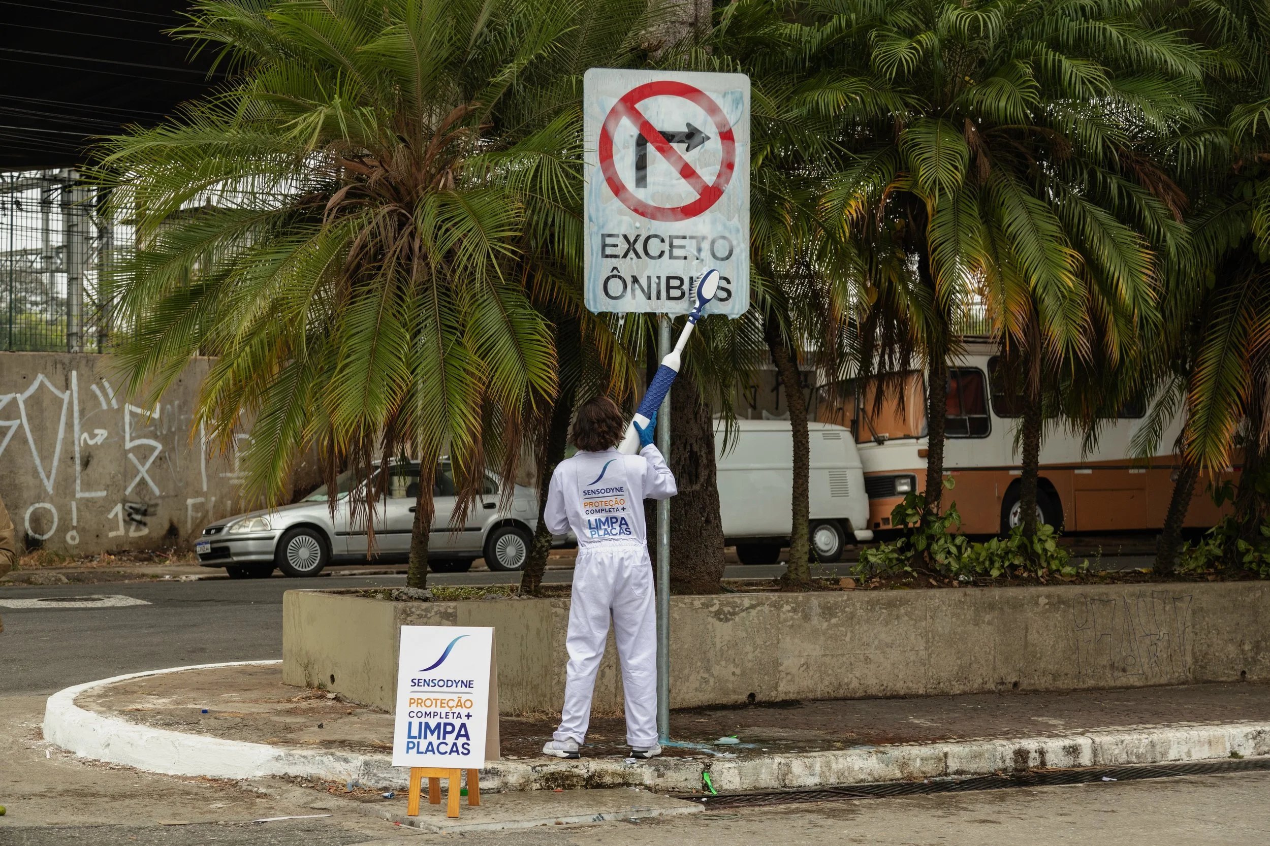 Fomos para as ruas de São Paulo transformar placas de trânsito sujas em exemplos brilhantes de limpeza, assim como a Sensodyne faz com os nossos dentes.
